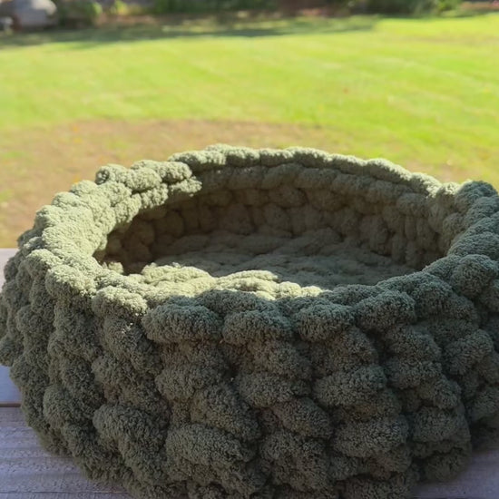 Bring warmth and charm to your home with this handmade chunky yarn pet bed.