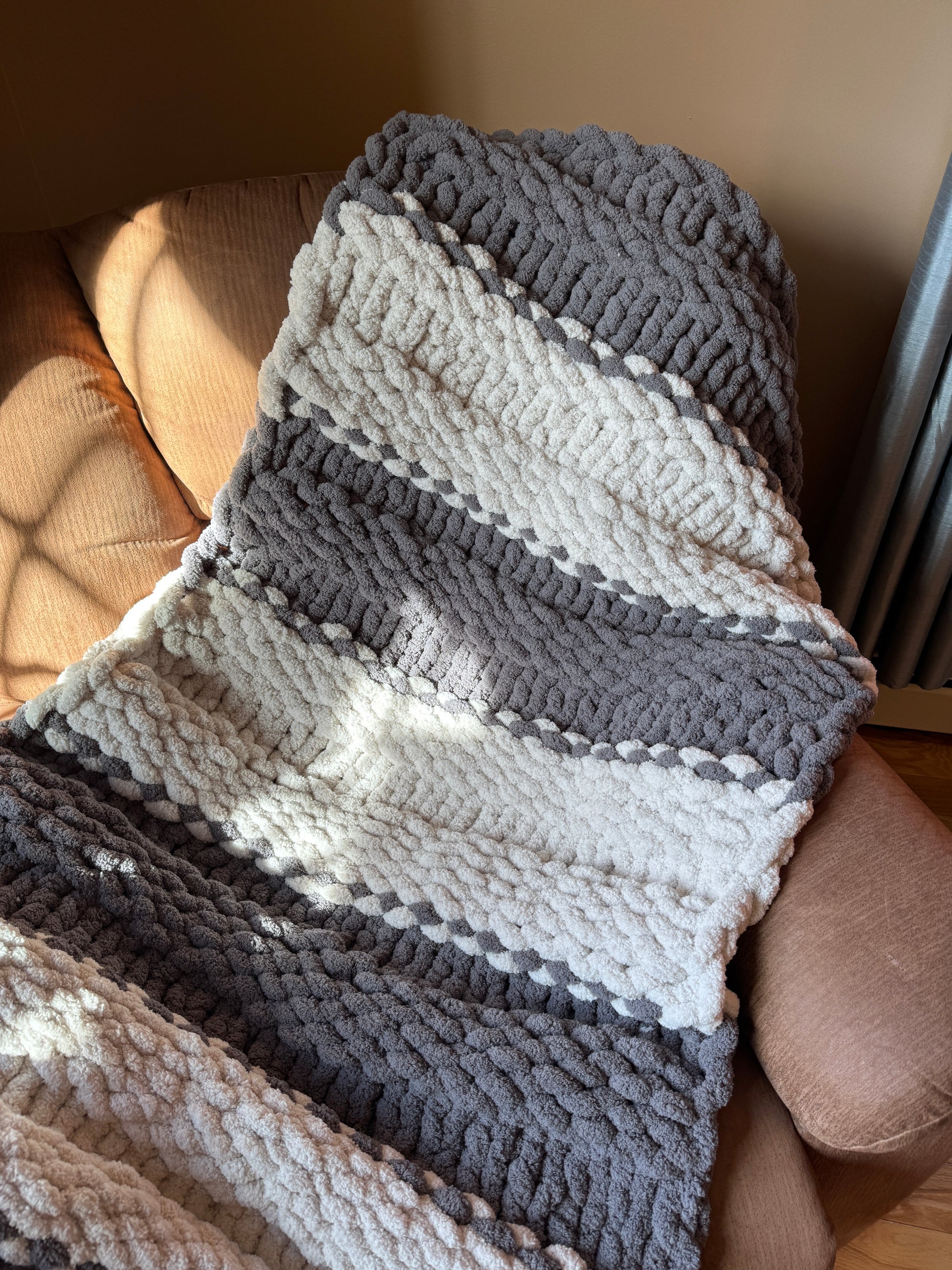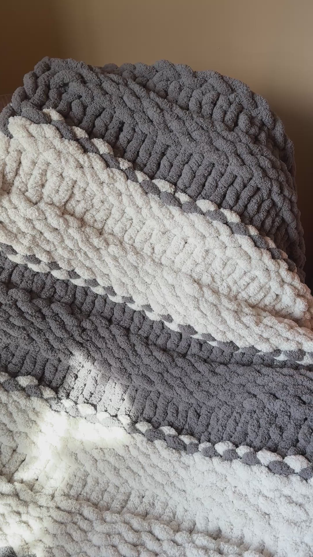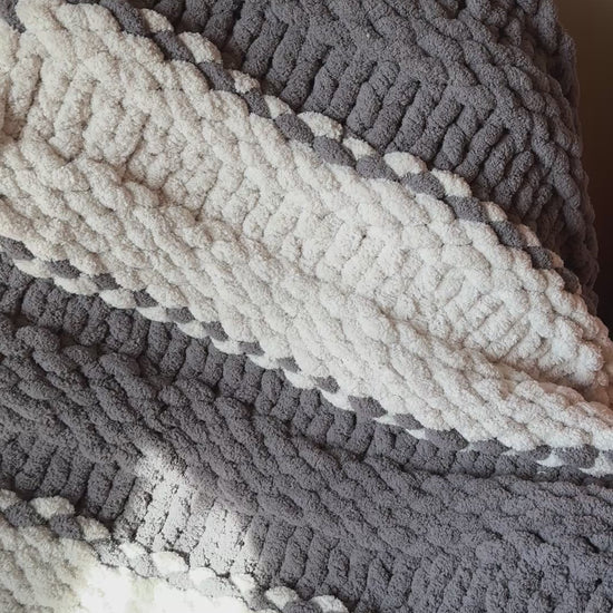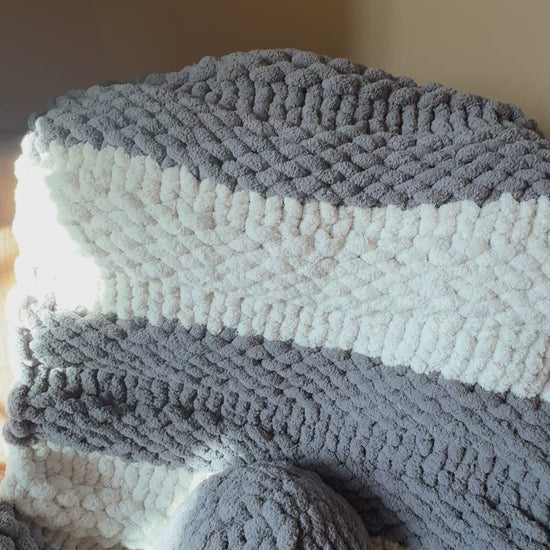 Wrap yourself in comfort with this handmade chunky knit set — includes one soft blanket and one matching pillow in elegant tones of gray and off white.