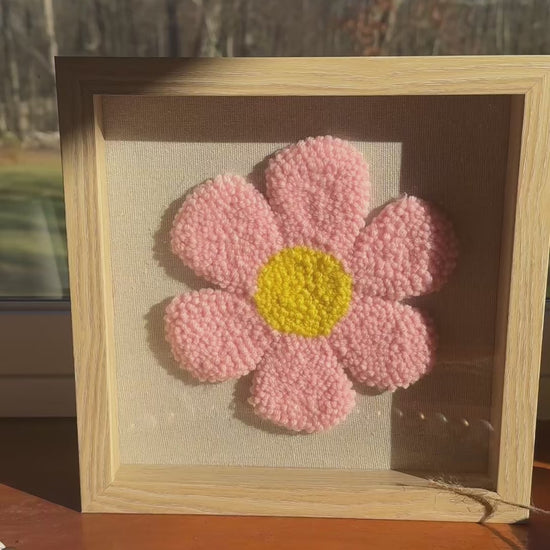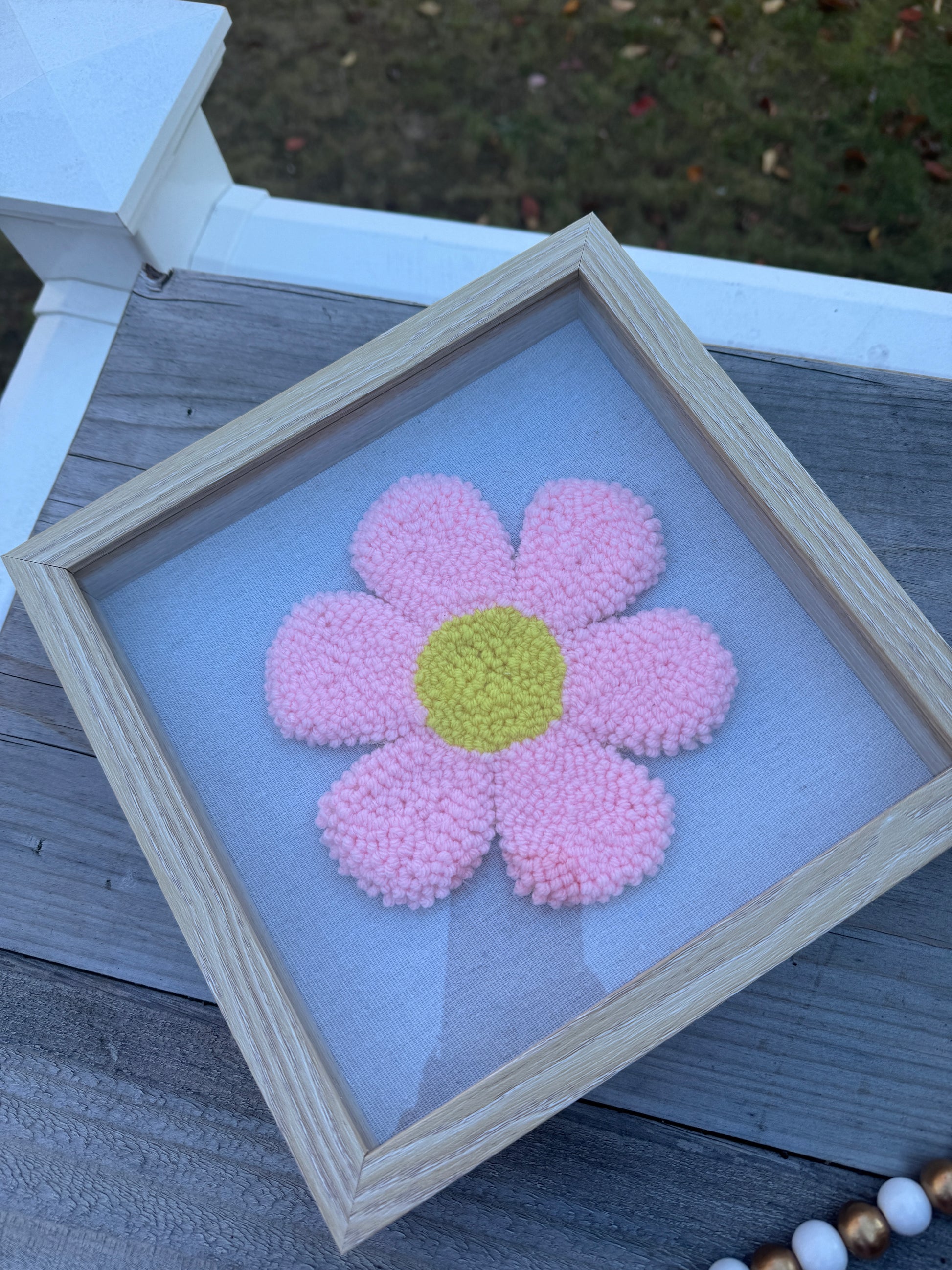 Pink Daisy Punch Needle Wall Art – Handmade Textured Flower Frame Decor