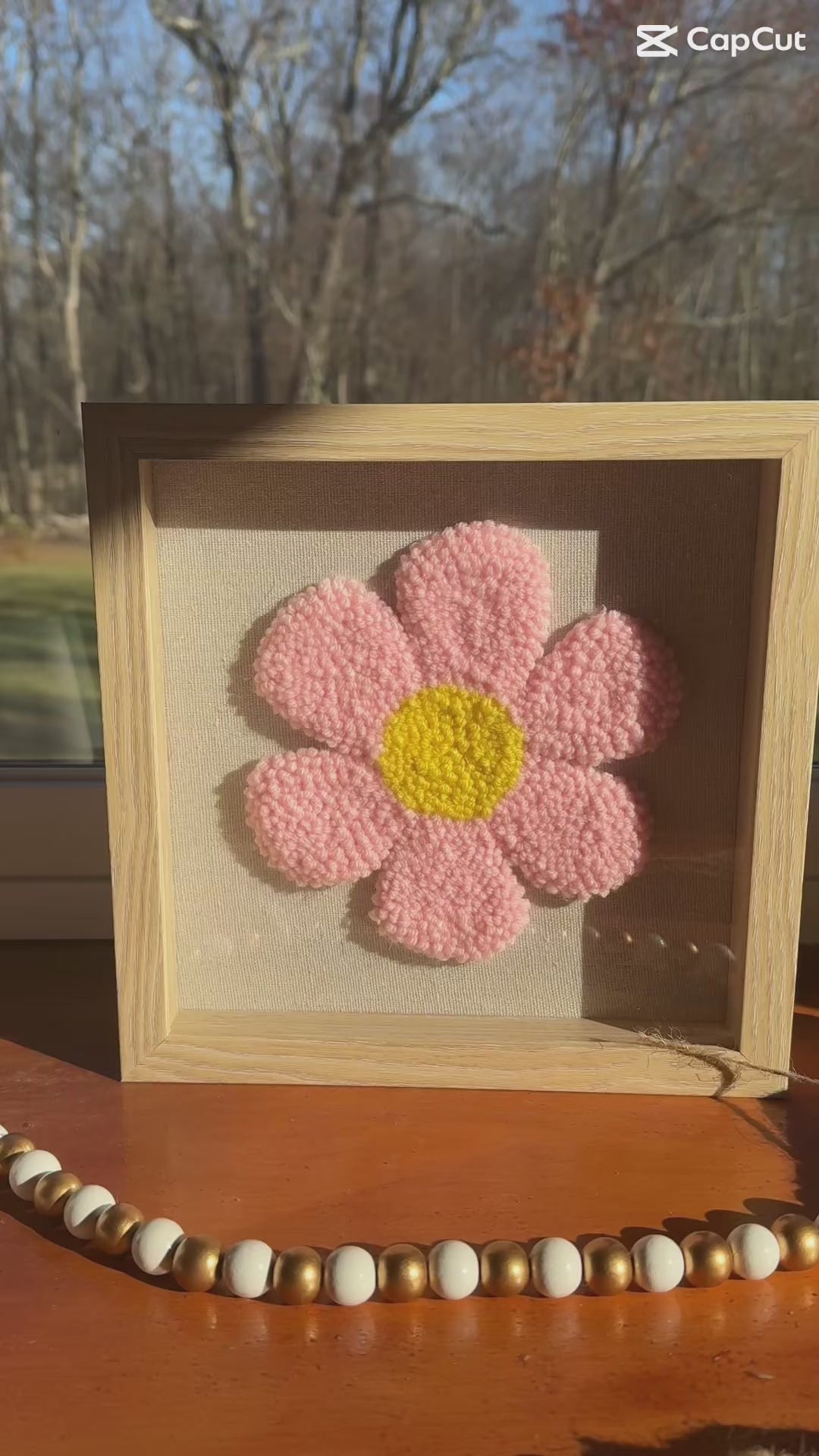 This handmade punch needle daisy is created with soft yarn and carefully glued onto a neutral fabric background, then framed in natural wood.